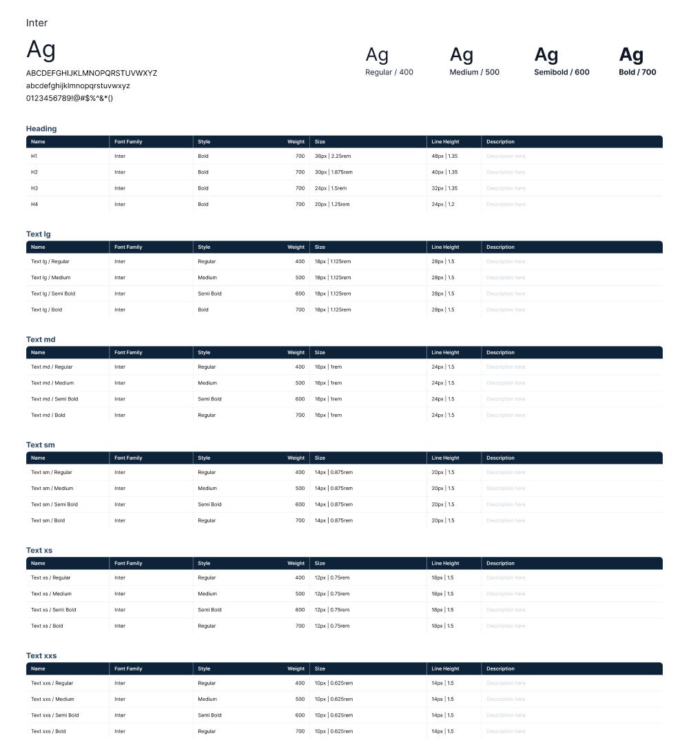 To ensure the typography remains readable and adaptable across different scenarios or devices, I started by choosing a clean and versatile typeface that could fit a wide range of use cases. Rather than over-customizing too early, I focused on building a solid foundation that balances clarity and flexibility. From there, I defined key details such as font sizes, weights, and hierarchy levels to create a consistent typographic rhythm that can easily scale as the system grows.